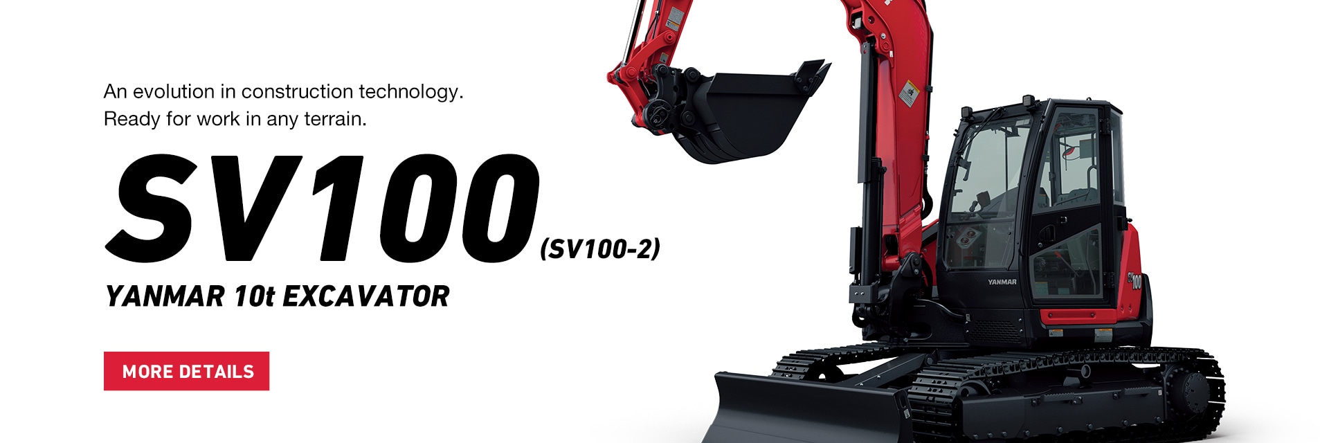 An evolution in construction technology, the Yanmar SV100-2, 10t excavator is work-ready in any terrain. A medium-sized excavator from Yanmar, with Ultra Tight Tail Swing also boom swing function, the SV100 can work in confined spaces and is perfect fit for large construction sites in urban or community areas.