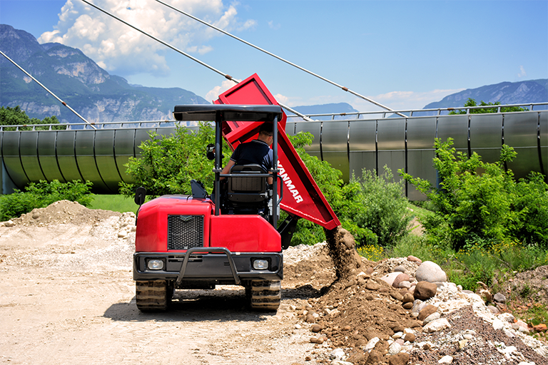 Si vous travaillez sur des tranchées, il est plus aisé et plus sûr de décharger latéralement. C’est pourquoi le Yanmar dumper C30R-3TV dispose d’une benne rotative montée sur un châssis pivotant qui peut tourner à 180 ° (90 ° à gauche et 90 ° à droite). Vous pouvez déverser le chargement en conduisant le long d’une tranchée et vous approcher au plus près du chantier, ce qui améliore la sécurité et la productivité. Vous bénéficiez également d’un pare-boue empêchant toute matière de tomber de la benne et d’endommager les composants hydrauliques ou de pénétrer dans le poste de conduite.