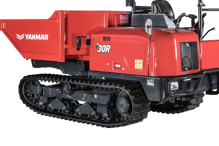 Chez Yanmar, compacité et capacité tout-terrain sont les maîtres mots. Nous avons donc développé un châssis exclusif capable d’évoluer sur les surfaces les plus accidentées tout en préservant sa durée de vie. Les galets de chenille absorbent les obstacles, et nous avons encore amélioré la force de traction et la stabilité en augmentant le diamètre du barbotin et la longueur des chenilles. Le poids est réparti au sol par 24 galets, ce qui préserve les chenilles et donne au Yanmar dumper C30R-3TV une excellente pression au sol qui lui permet de fonctionner même dans la boue profonde. Par conséquent, le C30R-3TV est parfaitement adapté au terrassement et au paysagisme.