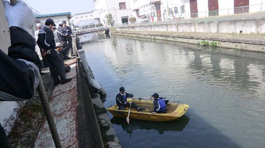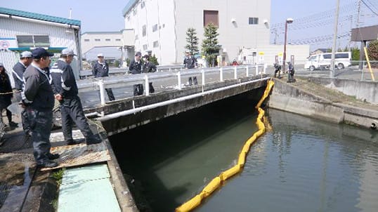 Every year around November, the Okayama Plant conducts drills that simulate an oil spill in the canals on the premises. About 25 people representing all workplaces gather to hear an explanation of how to use equipment such as oil absorption mats and oil fences according to the company manual on oil spill counter-measures. Participants then get into boats in the canals to practice using this equipment.