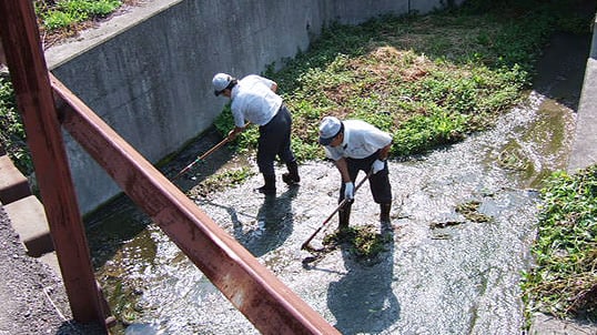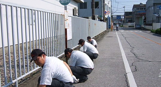 The Kouchi Plant strives to beautify its surroundings under its 'Clean-up Offensive'. This activity began with General Affairs and a few other divisions but has spread to include all plants in the area, resulting in greater environmental awareness among all employees. At the Kouchi Plant, the first Clean-up Offensive was held on June 6, a hot and sunny day that brought together a total of 38 employees including from Kouchi Plant affiliated companies such as Yanmar Seirei Total Service Co., Ltd. and SEG. Participants worked up a sweat picking up litter, pulling up weeds, and clearing ditches. The haul was about five or six garbage bags of cigarette butts, cans, plastic bottles, and weeds. They also cleaned the factory's drainage canals, where they discovered an abundance of life including killifish, loach, river crabs, prawns, and mitten crabs. This made participants even more aware of their responsibility to ensure that this valuable corner of nature is passed on to future generations. The Clean-up Offensive will continue to be held four times a year as a means of protecting the environment and promoting harmony with the community.