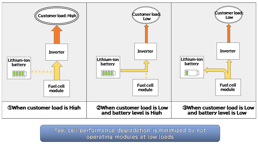 While the HP35FA1Z is mainly used for business or district electricity supply, where it operates as a distributed generation system that does not emit any CO2, its applications are also expected to include operation as a standalone electricity system that supplies the loads at a specific site during a power outage. Accordingly, the HP35FA1Z is equipped both with functions for grid-connected operation at rated output and the capability to vary its output over a wide range of loads. Unfortunately, frequent starting and stopping of a fuel cell tends to degrade its performance while operation at low load risks running up against the fuel cell module’s minimum output limit. For these reasons, additional measures were needed to enable these modes of operation.