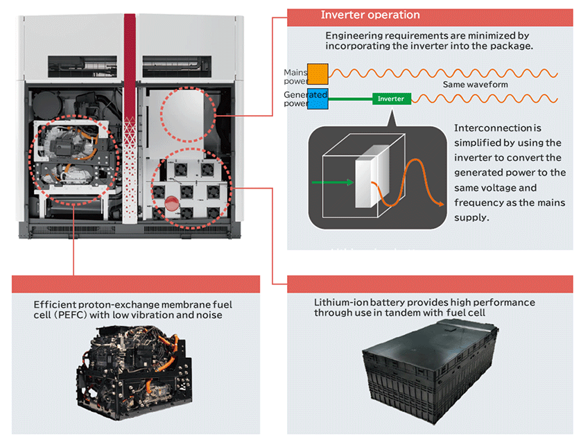 Figures 2 and 3 show the main system components and block diagram and Table 1 lists the specifications. The system combines a proton-exchange membrane fuel cell (PEFC) module with an inverter and lithium-ion battery. The inverter converts the direct current (DC) output of the fuel cell module to three-phase alternating current (AC) that can be output to the mains power supply or serve as a standalone power supply during a power outage. The lithium-ion battery is used to supply power when starting the fuel cell module, to store excess electricity during power outages, and for the output control function described later in this article.