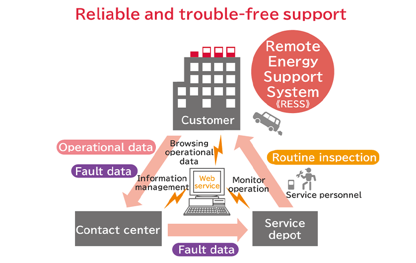 As noted earlier, the minimum ignition energy for hydrogen is lower than that of other fuels such as natural gas. Being a colorless and odorless gas, hydrogen leaks are also difficult to detect. This means that safety measures are needed to deal with any such leaks should they occur during operation. Not only does the HP35FA1Z system shutdown immediately and turn off the hydrogen supply on detection of a leak, but it also incorporates design features such as locating the ventilation fan in such a way that it maintains a pressure differential inside the system that prevents any leaked hydrogen from reaching or accumulating around electrical parts or other potential ignition sources (see Figure 9). Yanmar also provides a maintenance service using its Remote Energy Support System (RESS) (shown in Figure 10), with 24-hour/365-day operational data monitoring of its products and rapid support from local service staff in the event of a problem.