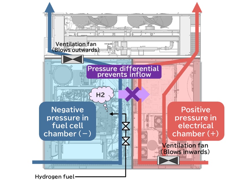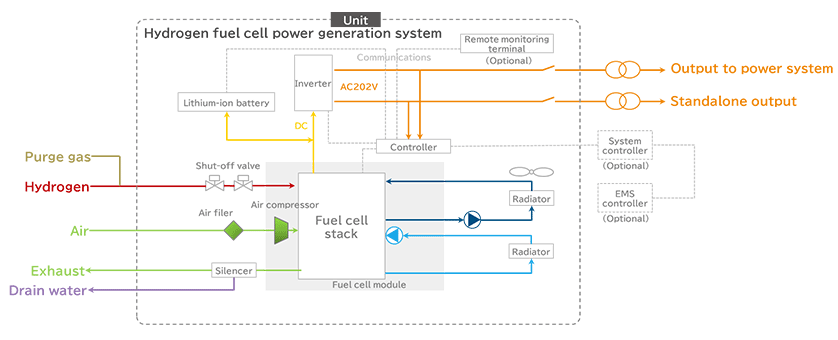 The HP35FA1Z (shown in Figure 1) is primarily targeted at businesses or municipalities investigating the use of hydrogen as a source of clean energy. It is anticipated that such customers will want to use hydrogen fuel cells to augment intermittent renewable energy generation, thereby ensuring the reliable supply of CO2-free electricity regardless of the weather or the time of day. The system also has potential applications in off-grid power generation and as a means of improving disaster resilience. Accordingly, the system must be able to support a wide range of operating patterns, with seamless output control from low load up to rated power, load-following capabilities for dealing with sudden load swings or disconnection, and the ability to operate under a supervisory controller such as an energy management system (EMS). As cost and the practicalities of installation are often major issues when considering a system like this, the unit also needs to be compact and easy to install. Reliability and support availability are also vital given that the systems are used for the supply of electricity. Safety design, meanwhile, needs to take account of the fact that hydrogen is a new fuel with characteristics that include requiring less energy than natural gas to ignite and being a colorless and odorless gas, making leaks difficult to detect.
