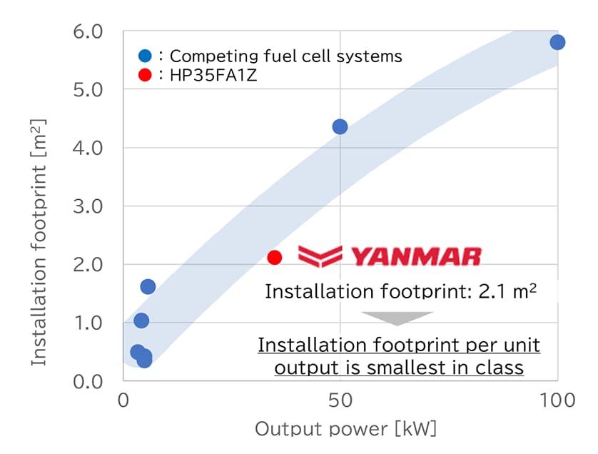 The HP35FA1Z uses automotive fuel cell modules that combine a high power-to-weight ratio with low cost. To enable its use for stationary power generation, Yanmar worked with the fuel cell vendor to verify that it complies with the laws governing this application and established practices to ensure that the required testing is performed during delivery inspection at the factory.