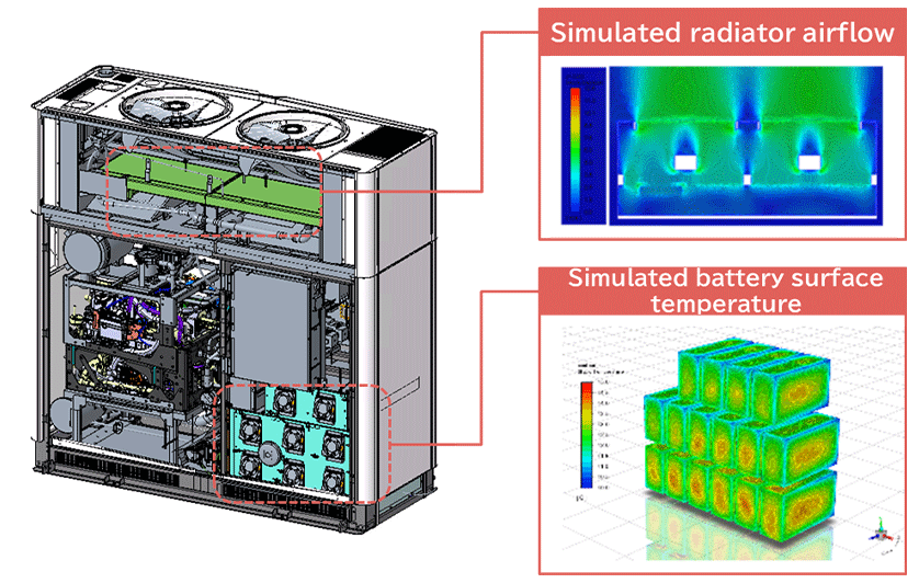 To reduce installation costs by minimizing the amount of on-site work needed to be undertaken by the customer, all the components required to operate the HP35FA1Z, including the fuel cell module, lithium-ion battery, and inverter, are housed in a single compact package. While the unit also includes a radiator to remove heat produced during power generation, this is made more difficult by the characteristics of PEFC cooling, which has an outlet water temperature of only about 70°C, closer to ambient temperature than the 90°C at which engine cooling water is typically discharged. The larger radiator necessitated by this was an obstacle to the goal of housing the unit in a compact package. To address this issue, Yanmar adopted a two-tier interior configuration to reduce the installation footprint, with the radiator on top and the fuel cell module and other electrical equipment on the bottom. This provided enough space for a large radiator. The practicalities of equipment transportation were also considered by installing the radiator horizontally rather than vertically, thereby keeping the height of the completed system to a minimum while still providing sufficient surface area for cooling. The air flows through the three components that require cooling (the radiator, fuel cell module, and electrical equipment) were also separated to ensure efficient cooling in each region. As shown in Figure 7, the ventilation design included system optimization in which computational fluid dynamics was used for simulation-based verification, including that the required air flow rates would be achieved and that component temperatures would remain within the target values.