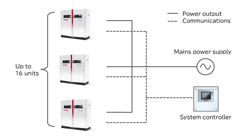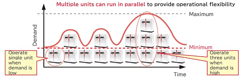 To overcome this problem, the HP35FA1Z is equipped with a lithium-ion battery in addition to its fuel cell module and uses hybrid operation whereby the control system switches to battery output when operating at low load (Figure 4). This enables the HP35FA1Z to minimize fuel cell performance degradation while still maintaining optimal output control across all loads. It also allows up to 16 units to be controlled in tandem by a single system controller, as shown in Figures 5 and 6, thereby providing optimal control of the number of operating units and total system output based on user electricity demand. Fuel cell degradation can be further minimized when operated in this tandem configuration through load balancing and rotation of the operating units to smooth their respective running times. The HP35FA1Z can operate in ways that suit customer needs, including functions for operating as part of a virtual power plant (VPP), microgrid, or other such service when connected to an EMS or other supervisory controller.
