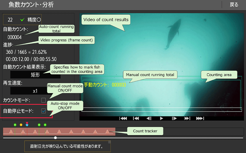 The count progress is also displayed in time-series format at the bottom of the screen, and this can be used to start playing the video from the corresponding frame by selecting the region of interest. By doing so, the user can quickly work through those video locations where fish are detected.