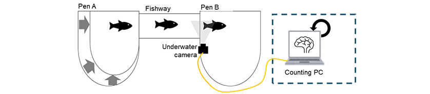 Instead, the practice has been to set up a fishway (a passage made from netting) between two pens. Fish are recorded on video as they pass through this passage, and this video is used to perform a manual count (see Figure 1). Unfortunately, this is very onerous work for the person doing the counting as it requires them to concentrate on the video and count hundreds or thousands of fish as they pass through. Although the video can be slowed down or played frame-by-frame, this only means that the count takes even longer than the duration of the video itself.