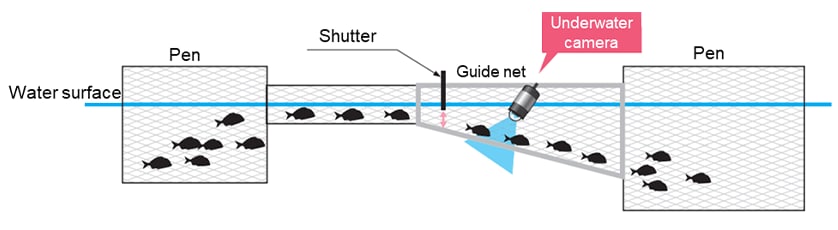 Meanwhile, the high cost of obtaining aquaculture sites and expensive labor and feed costs are driving a need for more efficient production management. This includes keeping track of the fish population in holding pens, which is important for optimizing feed quantities and formulating harvesting plans. A variety of different methods for doing so have been tried. Lifting up pens to count the number of fish inside is not practical for routine operation because of the cost involved and the stress it places on the fish. The alternative of using the weight of a pen to estimate how many fish it contains is likewise impractical for pens that are too large to lift or for migratory fish like tuna.