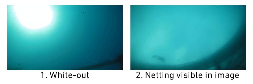Impairment due to environmental conditions includes partial white-out due to direct sunlight (e.g., Figure 6 [1]) or the presence of netting in the video image (e.g., Figure 6 [2]). This type of impairment degrades the count accuracy and can result in incorrect or under-counting by interfering with fish detection and tracking.