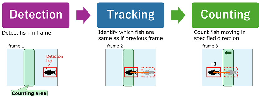 Counting is made up of the three steps shown in Figure 3, namely detection, tracking, and counting of individual fish. The initial detection step uses object detection AI to identify the fish visible in each video frame. The tracking step then identifies each fish in the subsequent frame based on how far they move. Finally, the counting step counts the number of fish that pass through the counting area (a predefined region of the video image) in the designated direction.