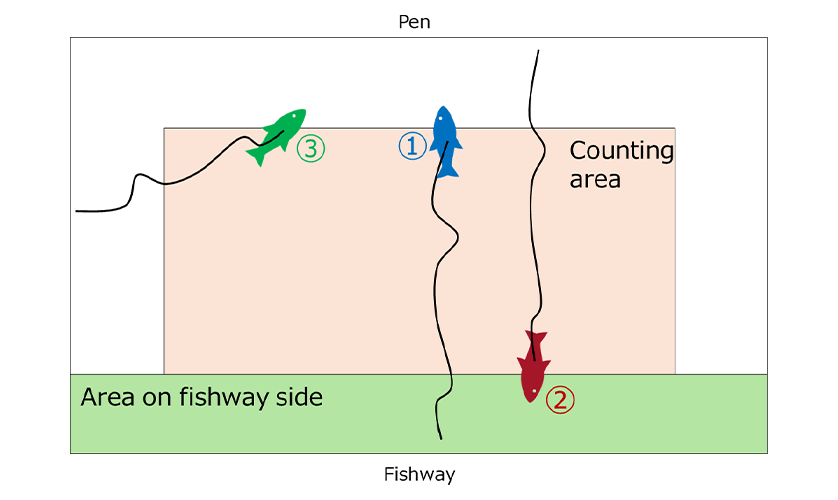 To prevent this, the boundary between the counting area and the area on the fishway side plays a role in deciding whether to count a fish. Only those fish (e.g., fish [1] in Figure 7) that enter the counting area from the fishway side and exit into the pen are added to the count. Back-swimming fish (e.g., fish [2] in Figure 7) that enter the counting area and then exit into the fishway are instead deducted. By contrast, fish (e.g., fish [3] in Figure 7) that enter the counting area without passing through the fishway and then swim back out into the pen are deemed to be circulating fish that have already been counted or else artefacts from the misidentification of seaweed, and so are neither added nor deducted from the count. In this way, by keeping track of the fish moving into and out of the fishway and counting areas, it is possible to minimize the miscounting of back-swimming or circulating fish.