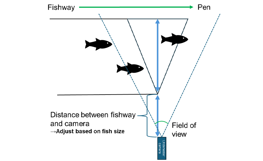 Juvenile tuna are about 0.3 m to 0.5 m in length and grow to more than 1 m as they mature. As the size of the fish varies significantly depending on their life cycle stage, capturing video of adult fish under the same conditions used for juveniles can result in poor count performance because the adults take up too much of the field of view. For this reason, as the fish get larger, it is necessary to provide a larger gap between the camera and the fishway, as shown in Figure 5.