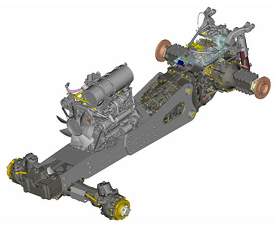 (2) Low-vibration and noise, vibration-isolating frame ・The engine and transmission are supported by a sturdy vibration-isolating frame on both sides. ・Durability has been improved and the front loader is attached directly to the frame. ・Vibration and noise are largely reduced with vibration-isolating mounts for each the engine and cabin. (Operator noise exposure 75dB(A))