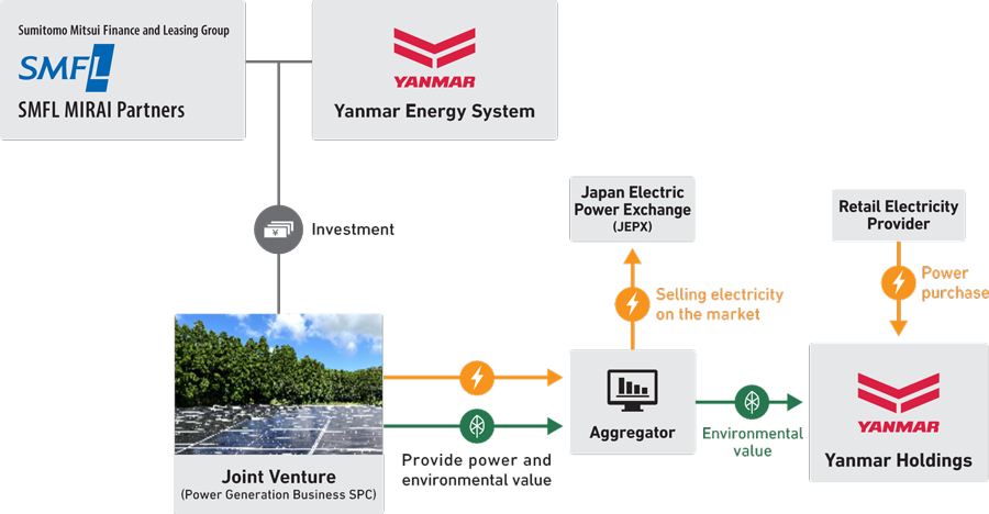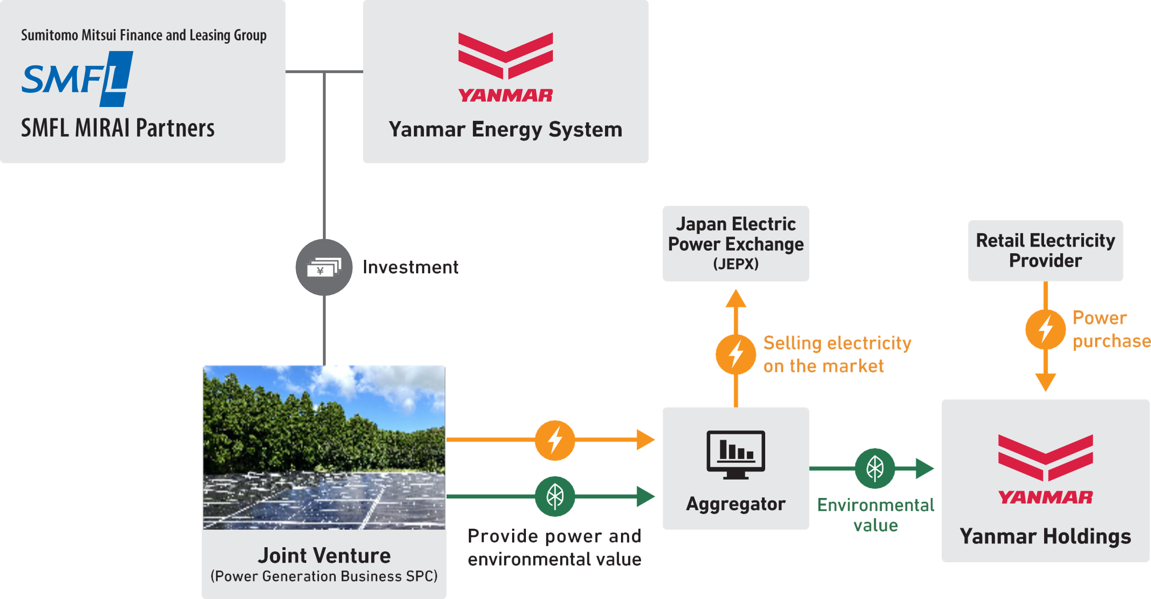 As part of the initiative, SMFL MIRAI Partners and Yanmar Energy System established a joint venture company (referred to as the power generation SPC) to supply renewable energy to Yanmar Holdings. In its first phase, the SPC has acquired nine high-voltage solar power plants with a total capacity of 10.9 MW. The additional environmental value2 created by these facilities will be supplied to Yanmar Holdings starting in December 2024 through an aggregator3.
