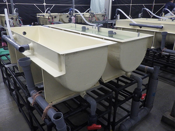 Using these findings and Yanmar HD’s fluid analysis, the team designed a new tank measuring 40 cm in diameter and 150 cm in length. Short-term rearing trials demonstrated that growth and survival rates matched or exceeded those in small tanks, with the ability to consistently rear thousands of larvae.