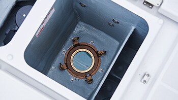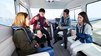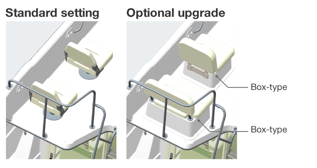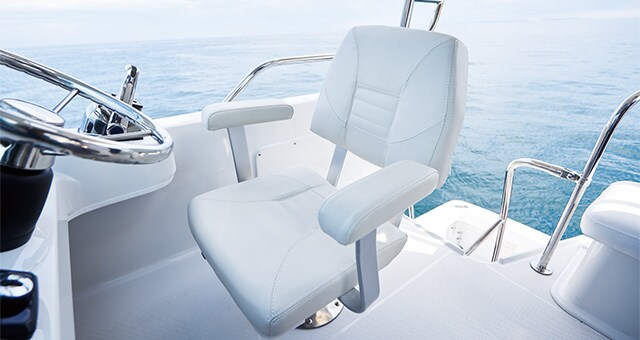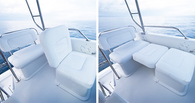 A sudden rain is of no concern with the hardtop flying bridge that allows you to enjoy comfortable maneuvering. The standard setting comes with two passenger seats. By opting for an optional upgrade to a box-type bridge, you can arrange the front seat into a flat bench, removing the backrest.