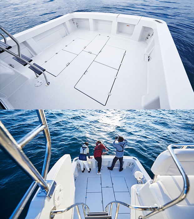 A wide and flat deck space with a maximum width of 2800 mm and a depth of 2800 mm is designed for an ease of movement and fishing. In consideration of varying fittings, VX34A is equipped with an open bulwark with the height of 640 mm.