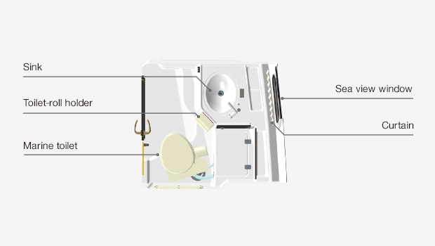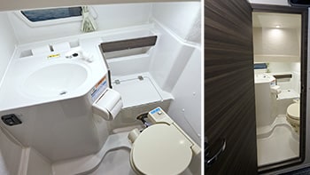 VX34A has a a bright and spacious private restroom with a head clearance of 1.7 m. It is equipped with an electric marine toilet and sink, and ensures an uninterrupted and pleasant sailing for everyone.