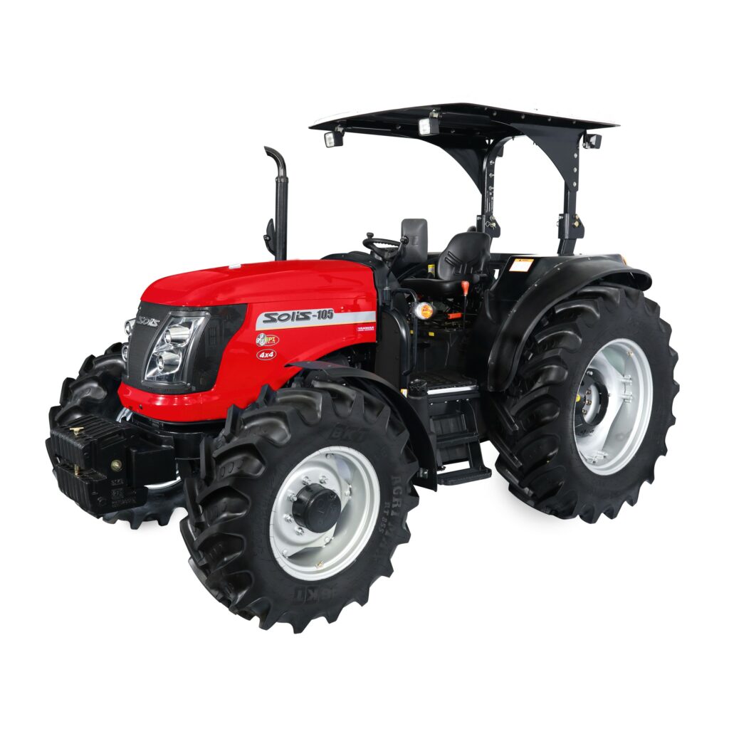 Model Solis 105 Type Type A Mesin Jenis Motor diesel, 4 langkah Merek International Tractors Limited Model 4105IVLT Level emisi Tier 2 Level Daya motor (kW(hp)) 78,3 (105) Jumlah silinder 4 kapasitas isi silinder (cm3) 4087 Putaran motor (rpm) 2200 Maksimum torsi (Nm) 430 Kapasitas tangki bahan bakar (l) 117 Panjang unit keseluruhan (mm) 4090 Lebar unit keseluruhan (mm) 2220 Tinggi traktor (dengan roda ban dan kanopi) (mm) 2710 Titik bagian terendah (mm) 455 Jarak poros roda depan belakang (mm) 2360 Bobot operasi (kg) 4085 Sistem transmisi Syncromesh Jumlah percepatan 12 Maju +12 Mundur Drive Type 4WD Kecepatan putar PTO 540/1000 Kategori 3-titik gandeng 3 Kapasitas angkat penggandeng (kg) 3500 Diameter ban depan (mm) 1230 Lebar tapak ban depan (mm) 365 Diameter roda belakang (mm) 1640 Lebar tapak ban belakang (mm) 460