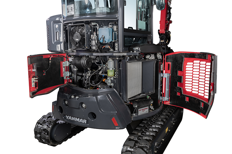 Il display a colori da 4,3” fornisce tutte le informazioni essenziali per la manutenzione: consumo carburante, livello carburante, temperatura del liquido di raffreddamento, oltre a messaggi di errore chiari e icone intuitive che agevolano la programmazione e la diagnostica. La macchina è progettata per semplificare ogni intervento di manutenzione: il cofano motore e il pannello laterale destro si aprono facilmente, consentendo ampio accesso a componenti chiave come filtro aria, compressore, radiatore, batteria e serbatoio carburante. I pannelli laterali removibili e il pavimento della cabina apribile permettono l’accesso diretto agli elementi idraulici, mentre il tappetino piatto facilita le operazioni di pulizia interna.