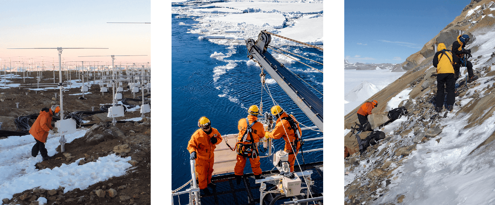 南極観測は、気象、⼤気、氷床、海洋、地質、⽣物、宇宙など多岐にわたる分野で⾏われており、地球環境や⽣命の起源、気候変動の解明など、国際的にも重要な科学的成果を⽣み出してきました。