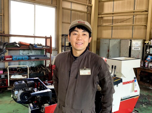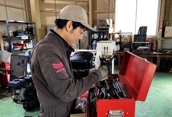 糸島支店の技術担当として機械の点検整備や修理に携わっています。基本は支店で仕事をしていることが多いですが、田植えや稲刈り時期など大きな機械が動く時期は、出張修理も行います。ヤンマーの機械を修理することはもちろん、他社の機械を整備することもあります。お客様のお困りごとの解決を一番に考え、壊れている機械を復帰させることも大切な役割です。また、農機の故障は使用中に起こることが大半で、機械が故障すると農作業が止まってしまいます。特に田植えや稲刈りのシーズンは作業が止まるとスケジュールが乱れるだけでなく、お客様の収入にも大きく影響します。そのため、少しでもお役に立てるよう出来る限り迅速な対応を心がけています。