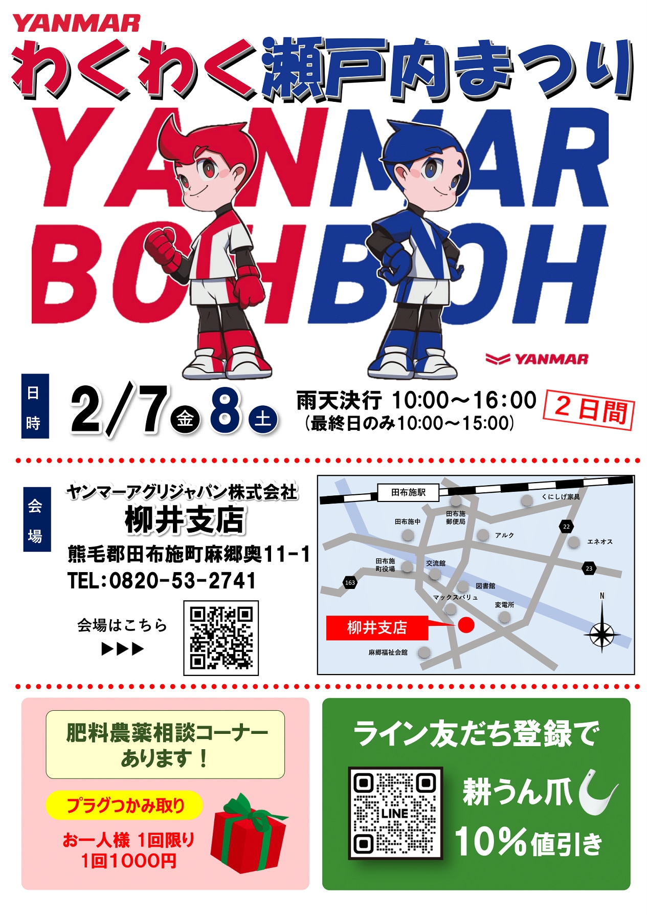 ヤンマーアグリジャパン株式会社 中四国支社 柳井支店 TEL: 0820-53-2741 |