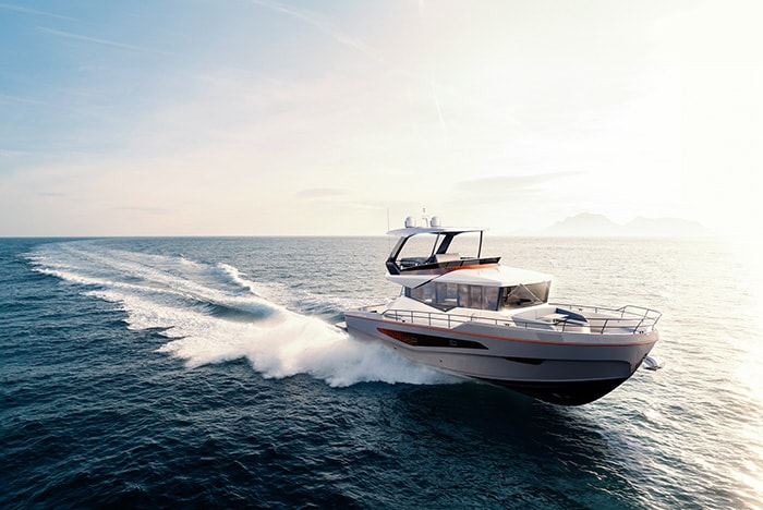 優れた燃費と動力性能を誇り、世界の海で信頼を得ているヤンマーの高出力クリーンディーゼルエンジン「6LT型」を2基搭載しています。加えて、最新のテクノロジーを駆使した操船支援システムの数々を搭載可能とし、ストレスフリーなイージードライビングと抜群の乗り心地は、フラッグシップ艇の名を体現しています。