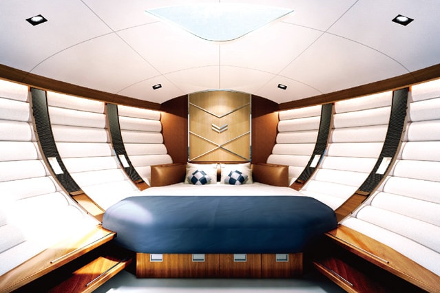 パワーボートを思わせるスポーティーでワクワクできるデザインでありながら、サロンには2つのベッドルームを備え、2組のカップルがゆったりと滞在することを想定した贅沢な内装空間を特徴としています。