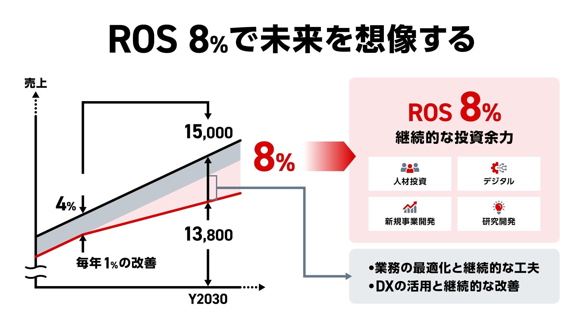 ヤンマーグループは、2030年に売上高 1兆5,000億円、ROS(売上高営業利益率)8%の達成を目標としています。ROS 8%は、顧客への提供価値を継続的に高めるために必要な収益性水準と位置づけ、全社的なDXによる経営効率化・業務生産性の向上を通じて達成を目指します。