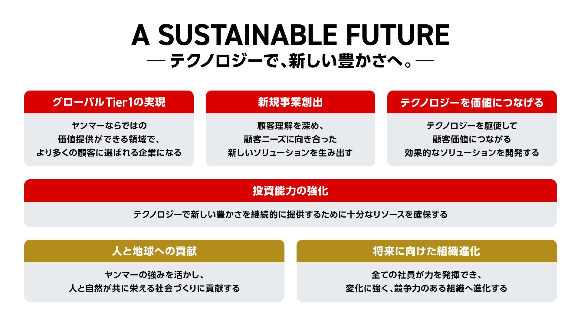 こうした認識のもと、ヤンマーホールディングスはMTP2030において、「新規事業の創出」「テクノロジーを価値につなげる」「将来に向けた組織進化」など6つの戦略テーマを設定しました。