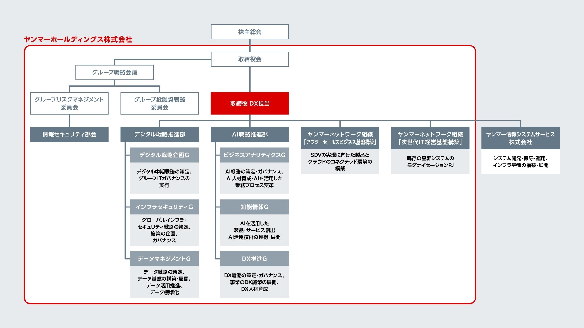 AI活用ではヤンマーグループの全社員がAIを当たり前に使う姿を実現することを目指しており、そのためのツール提供とともに教育プログラムを提供し、事業や地域のキーマンを中心に人材育成を推進しています。また、そのようなボトムアップのアプローチだけではなく経営課題へアプローチするEnd to Endでの業務プロセス改革を進めています。さらに、ヤンマーのお客様にもAIの力をフル活用していただけるように、事業の企画部門と連携して製品やソリューションへのAI活用の企画を産み出しています。