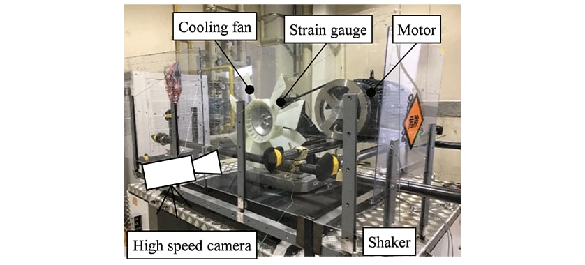 図3に解析モデルの精度を確認するための実験装置の概略を示す。電磁加振器に冷却ファンシステムを搭載し、4気筒エンジンの上下の振動を模擬するため上下方向に加振した。 同時にVベルトとモータを用いて冷却ファンを駆動した。共振点を把握するためにブラケットには、ひずみゲージを接着している。冷却ファンの回転速度を一定回転に保持しながら一定加速度で周波数掃引加振をおこなった。周波数掃引加振時のひずみゲージの出力から共振を確認し、振れ回り振動の固有振動数を求めた。また、高速度カメラを用いて、共振点における軸心変位を冷却ファンの前面から観察した。
