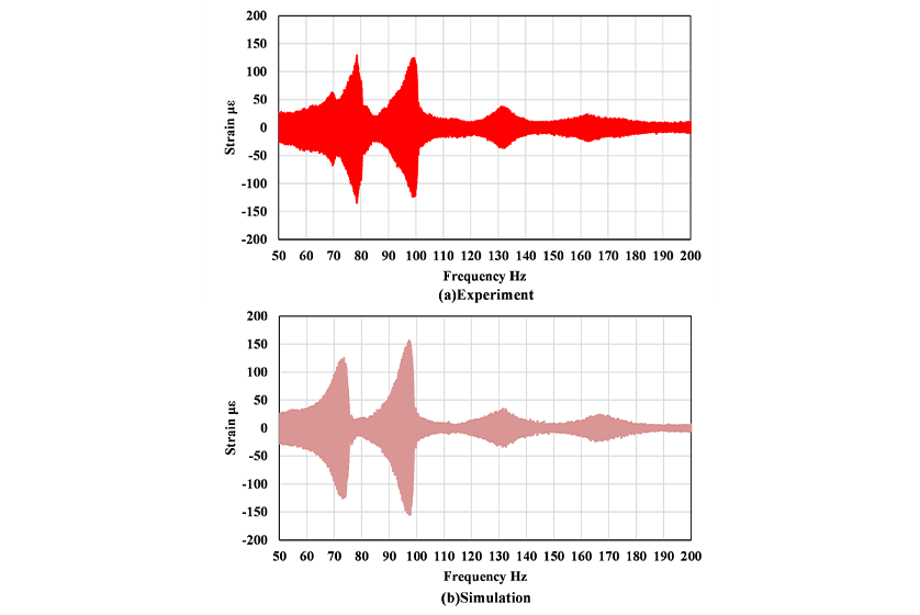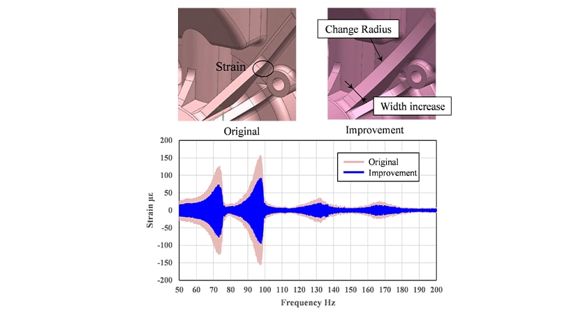 図6は、ブラケット部のひずみゲージの出力と機構解析による予測結果を比較したものである。実験結果、予測結果ともに75 Hzおよび98 Hz付近でひずみの振幅が増大し、両者はよく一致している。ブラケットの形状を変更した場合のブラケットに発生するひずみの予測結果を図7に示す。リブ部のひずみの低減を狙いリブのRを5 mmから8 mm、リブ幅を現状より2 ㎜増加させた。形状変更により、共振回転速度は変化しないが共振点でのひずみは、75 Hzで46 % 97 Hzで43 %低下した。これは、形状変更により固有振動数は変化していないが、対象部位の局所的な剛性が変化し、ひずみが減少したこと示す。以上より、機構解析を用いて、システムの構成部品の詳細形状の検討が可能であると言える。