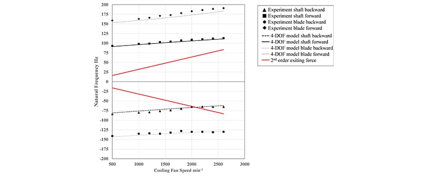 は、ジャイロ効果により前向き、後向きの固有角振動数が存在し、冷却ファンの回転速度によって固有振動数が変化する。また、翼系および軸系、それぞれに対する前向き、後向きの四つの固有角振動数が現れる。