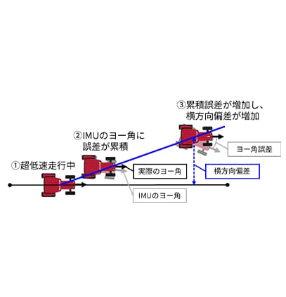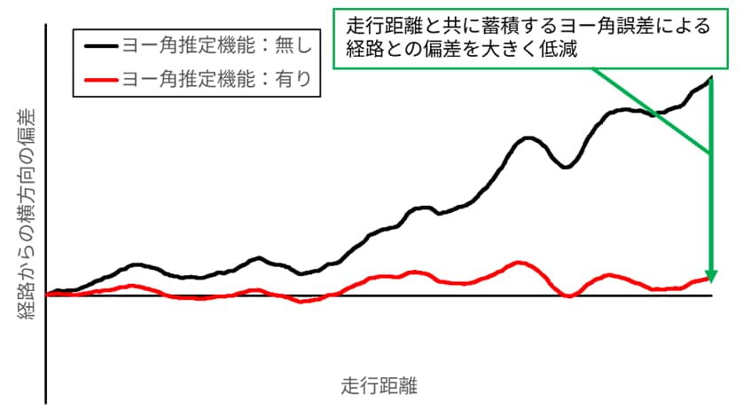 図11に超低速走行時でのヨー角推定機能の有無の比較結果を示しています。ヨー角推定機能が無い場合、徐々にヨー角の誤差が増加し、車両が経路から離れています。一方、ヨー角推定機能を適用することで、高精度なヨー角を算出し、車両が経路から離れることを抑制しています。