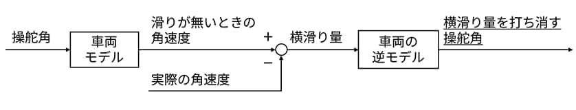 そこで、車体の偏差だけではなく横滑りの開始を検出し、即座に横滑り分を補正する横滑り抑制制御を開発しました(図6)。この横滑り抑制制御では、操舵角と車両モデルから算出される滑りが無いときの角速度と、実際の角速度を比較し、横滑り量を検出します。そして、検出した横滑り量から、車両の逆モデルを使用して、横滑り量を打ち消す操舵角を算出します。これを制御出力とすることで、横滑りを即座に補正しています(特許出願中)。