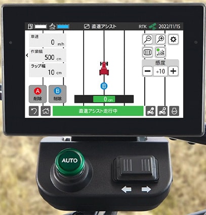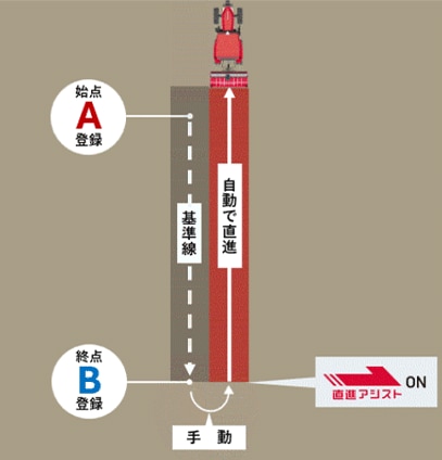 直進アシストの使い方はシンプルで、A点登録→B点登録→直進開始の3つの手順で自動操舵を開始できます(図3)。直進アシストの画面(図4)も直感的に分かりやすい、シンプルな画面にすることで、誰でも手軽に自動操舵を行えるようにしました。