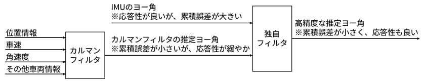 ヤンマーはこの課題に対し、カルマンフィルタを主とする独自のヨー角推定機能を開発しました(図10)。本機能の特徴は、IMUのヨー角とカルマンフィルタで推定したヨー角のそれぞれの特性を活かしている点にあります。IMUはヨー角変化に対する応答性が高い一方、超低速時には誤差が蓄積しやすいという特性があります。対して、位置情報・車速・角速度などを入力とするカルマンフィルタによる推定ヨー角は、車両情報に基づくため超低速でも誤差が少ないものの、位置のフィードバックも用いるため応答性は相対的に緩やかです。そこで、それらの良い特性を組み合わせる独自のフィルタを開発し、超低速時の誤差を低減した高精度なヨー角の算出を可能にしました(特許出願中)。