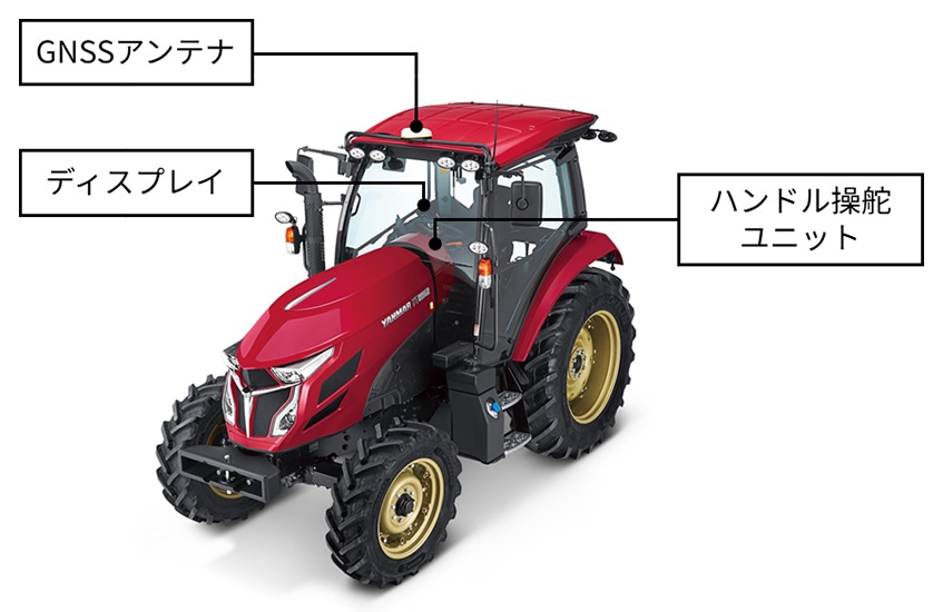 ヤンマーの直進アシストトラクターは、GNSSアンテナ、ディスプレイ、ハンドル操舵ユニットで構成されています(図2)。GNSSアンテナで取得した情報と、ディスプレイで設定した目標経路に基づいて自動操舵演算を行い、ハンドル操舵ユニットが操舵角を制御することで、直進走行を行います。