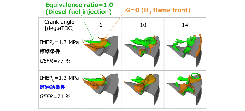 いずれの条件でも、ディーゼル噴霧が自着火した後、噴霧燃焼が着火源となり、水素予混合気への火炎伝播が開始される。ディーゼル噴霧はその貫徹力で先に燃焼室の外周に到達し、燃焼を継続している間に、水素予混合気の伝播火炎も燃焼室の外周に到達する。いずれもディーゼル噴霧燃焼には大きな差が見られない(6 deg.aTDC)。一方で、水素予混合気の火炎伝播は、より希薄な条件で遅くなる(10~14 deg.aTDC)。これは、希薄条件下で水素予混合気の燃焼温度が低下し、火炎伝播速度が減少したためと考えられる。