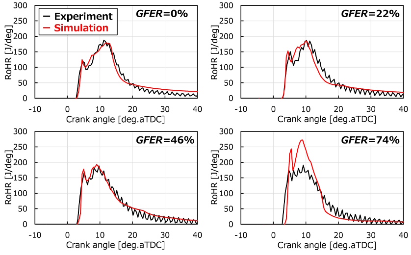 が74%の高い条件では、着火遅れが長くなり、実験値と若干の乖離が見られる。この乖離は、エンジン筒内の温度場や軽油噴射量が少ない条件での噴霧形態の解析精度に影響されている可能性がある。
