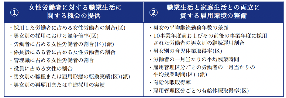 のいずれかの項目から1項目以上選択し、求職者がいつでも女性活躍推進に関する情報を閲覧できるように公表することが新たに義務付けられています
