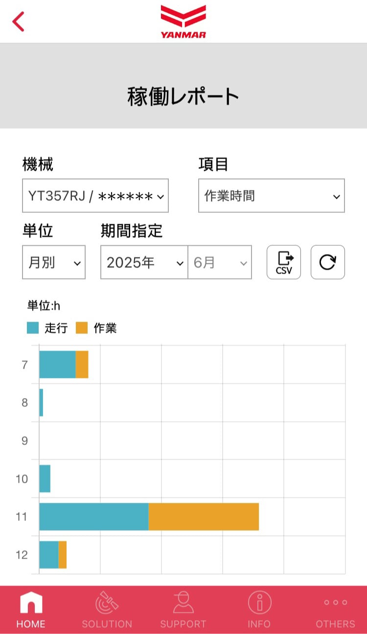 | 稼働レポート | 作業時間/走行距離/燃料消費率/燃料消費量/エンジン回転数/エンジン負荷率 |