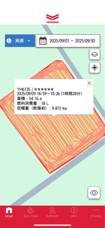 機械が動いた軌跡や作業したほ場を、スマートフォンアプリ「MY YANMAR」の地図上で確認できます。また、収穫量センサーを搭載したコンバインで収穫した場合は、ほ場ごとの収量やメッシュ単位の収量も表示できます。