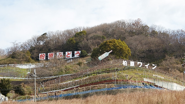 カタシモワイナリーの園地は、市内を流れる大和川から急な勢いで立ち上がってくる山の傾斜地にある。他産地と比べると、園地の管理には手間がかかるそうだ。傾斜がきつい上、一枚当たりの畑の面積が小さいからである。