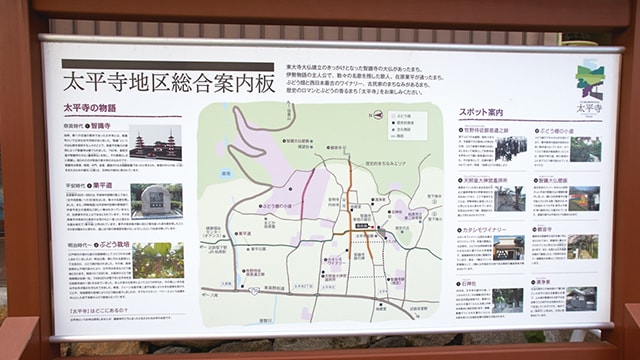 髙井さんがブドウやワイナリーの振興と合わせて力を入れているのは観光。カタシモワイナリーがある柏原市太平寺は、丘陵地でも標高の低いところは住宅地があり、そこから登っていくとやがてワイン畑が広がる。住宅地には有形無形の歴史が点在している。たとえば遺跡となっている7世紀に建立された智識寺は、かつてその廬舎那仏を拝した聖武天皇が、真似て東大寺に大仏を造ったとされる。また平安時代の歌人である在原業平が河内国の高安に向かう際に通ったとされる道も存在する。